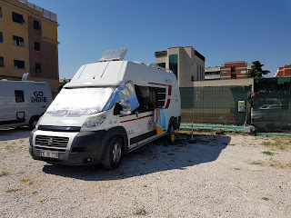 Bir başka kampingin adresini alıp tekrar yola koyulduk, bu arada akşam trafiği de başlamıştı. İkinci yer de bizim için yetersiz olunca, merkeze biraz daha uzak, ağaçsız ama duş ve tuvaletleri olan bir Karavan Parkı bulduk. Böyle durumlarda, yanımızda götürdüğümüz telsizlerin ne kadar işe yaradığını bir kez daha anladık. Trafikte kalıp birbirinizi göremeyince, telsiz sayesinde iletişim kurabiliyorsunuz, ya da otobanda beklenmedik bir durumla karşılaşınca tam bir kurtarıcı oluyor telsizler… Area Sosta Camper-Roma, gölgesi olmamasına rağmen, ulaşımının kolaylığı ve işlevsel özellikleri ile bizim için yeterliydi.